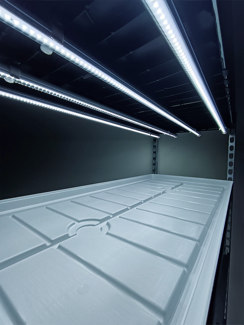 • Gestion de la Lumière : Chaque étage est équipé d'un éclairage fixe garantissant une distribution uniforme des photons sur chaque plante, évitant les zones d'ombre.
